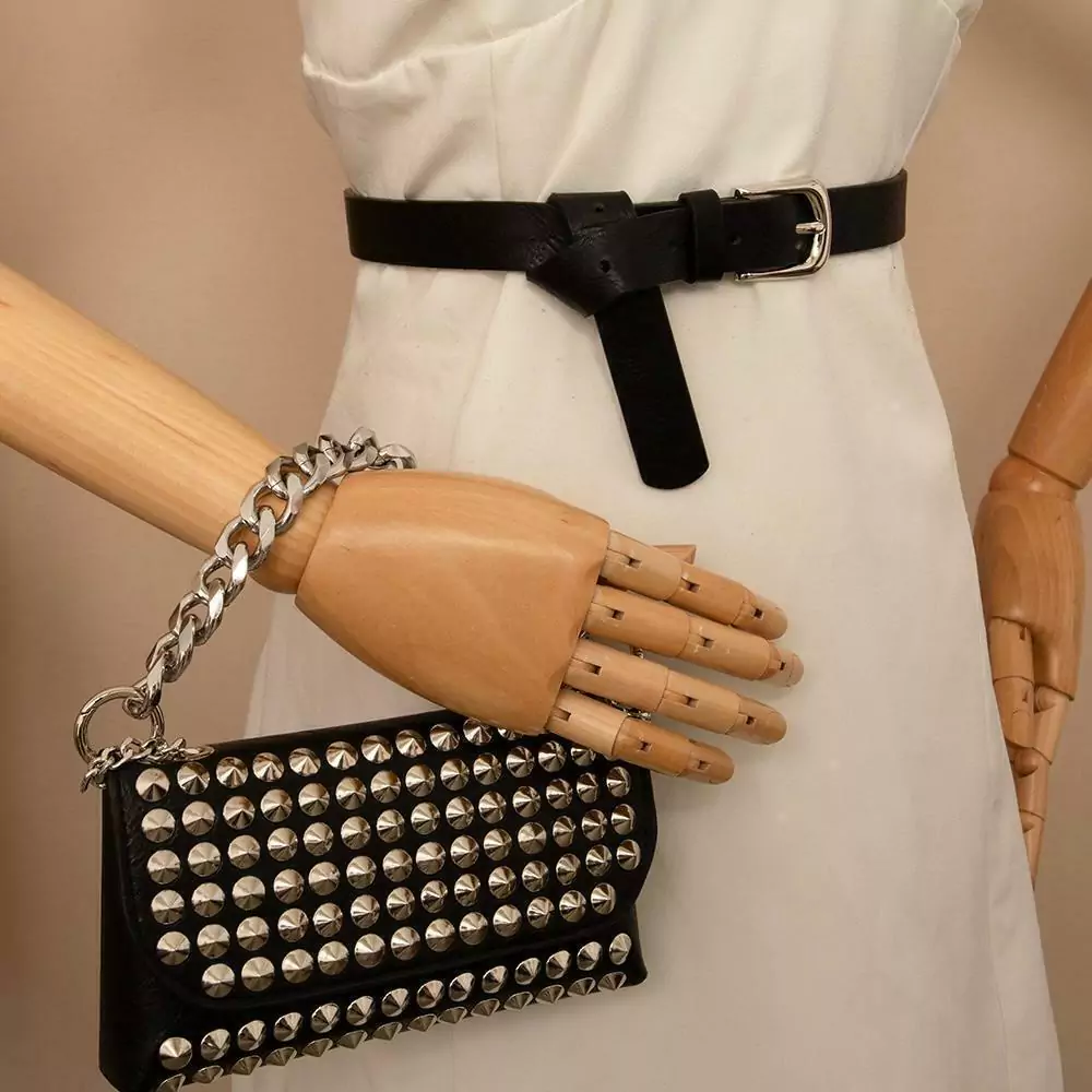 Este cinto com pochete é a escolha para quem busca estilo praticidade em uma única peça. A pochete, adornada com imponetes apliques em spik metalicos, proporciona uma estetica ousada e moderna, ideal para destacar qualquer look. A corrente robusta, que serve como alça, complementa o design com um toque de sofisticação e resistência.